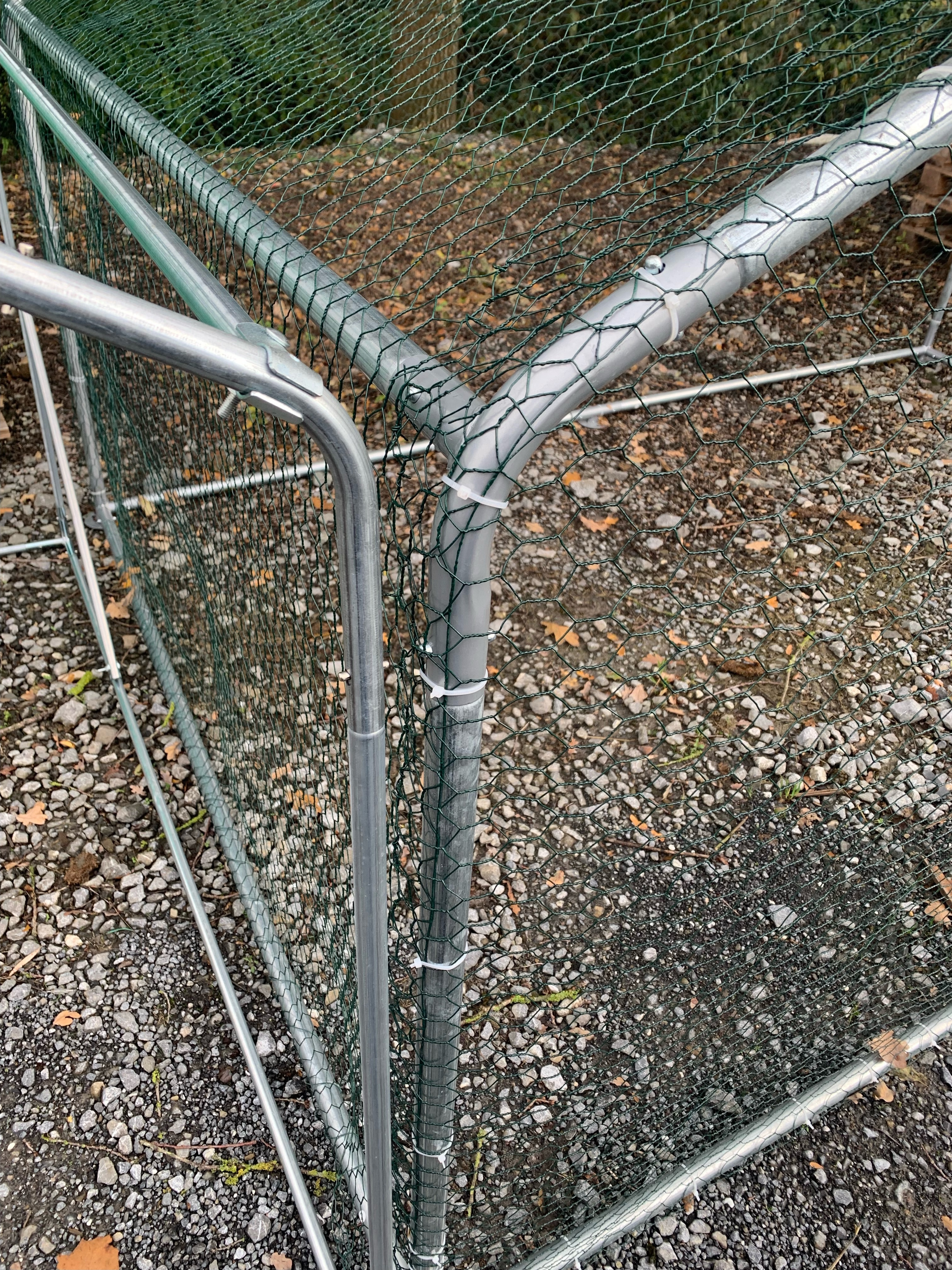 Sa conception permet un assemblage aisé, même pour une personne seule. Il suffit de connecter les éléments de la structure les uns aux autres pour former l'enclos, puis d'attacher le grillage à cette structure en utilisant des colliers de serrage autour des quatre poteaux métalliques qui constituent les coins de l'enclos.
