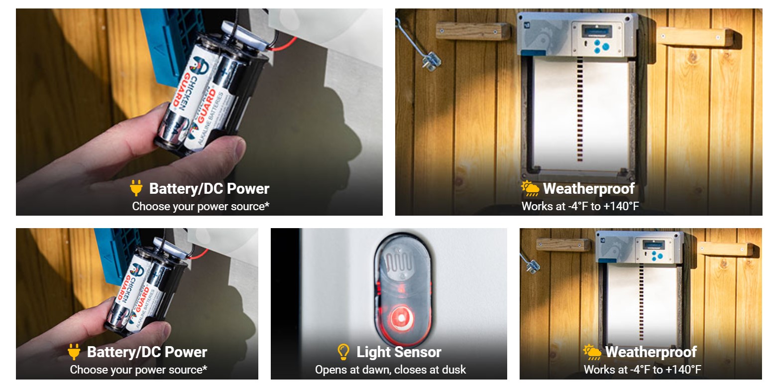 La technologie embarquée dans le ChickenGuard All-in-One assure une expérience utilisateur sans égal. La sécurité accrue, comparée aux portiers à ficelle, élimine tout risque de coincement ou de chute de la porte. Les programmes personnalisables selon les horaires ou la lumière naturelle et l'alarme intégrée garantissent une protection continue et fiable.